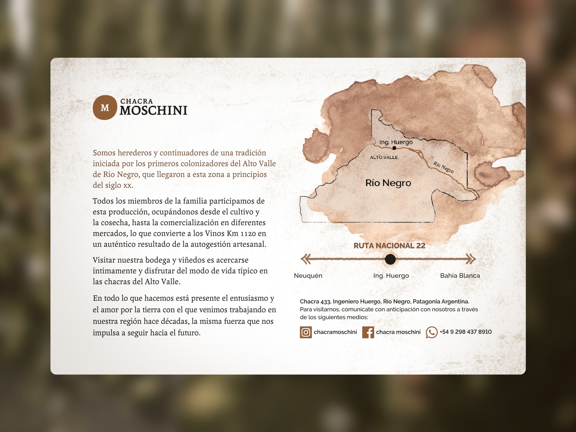 The result was Chacra Moschini, a root brand firmly anchored in the traditional values of Italian rural heritage and the local terroir, with a heterogeneous set of extensions: wines, liqueurs, jams and preserves, rural lodging, regional cuisine, and enotourism.